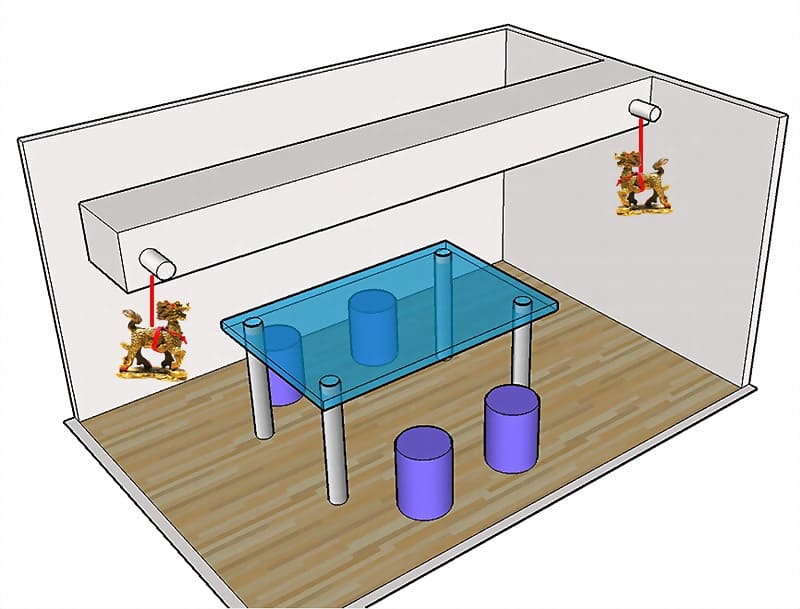 其本身下壓之氣場磁場相當大,所以如果人長時間停留之處絕對不可有梁,