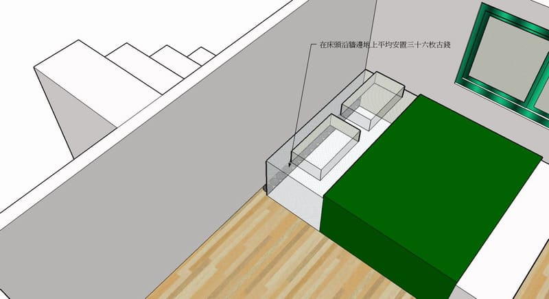 如果可以最好調整床位,如果無法調整床位建議可以在床頭靠樓梯之牆面地上平均安置36枚古錢來區隔氣場作化解。