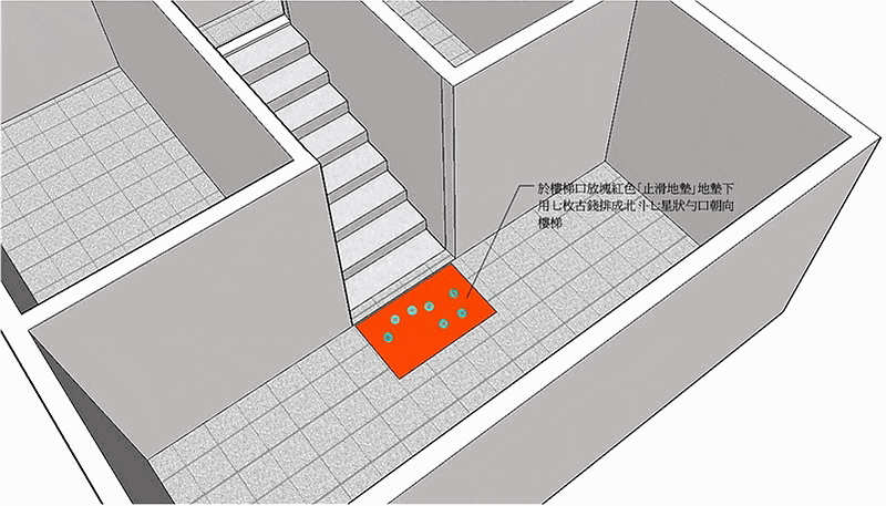 在樓梯口放塊紅色之止滑地墊,地墊下用七枚古錢排成北斗七星狀讓其勺口朝向樓梯補足此處所缺之氣場。