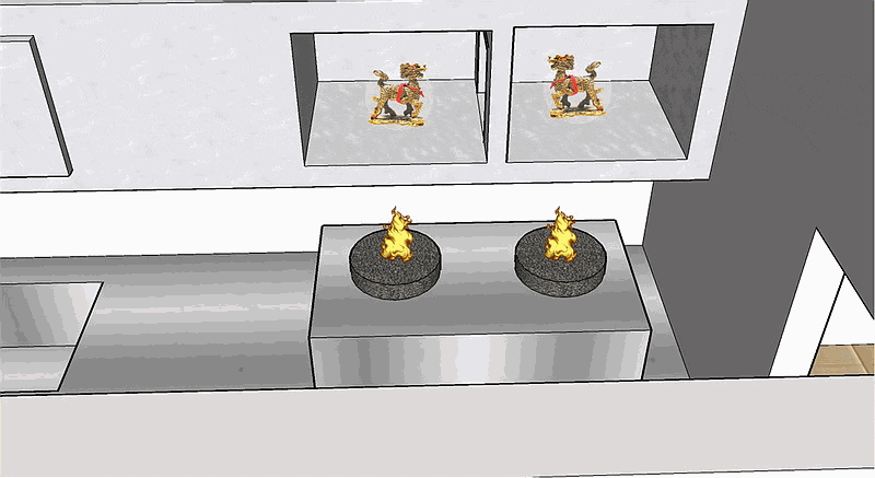 除加強抽風空調設備外,於瓦斯爐上方櫥櫃內安置一對麒麟踩八卦制化火煞。