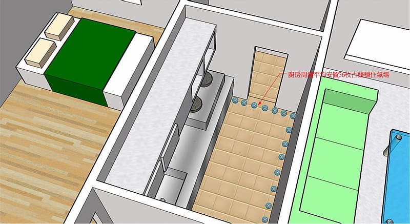 並于廚房周邊沿牆邊地上平均安置36枚古錢來穩住廚房之氣場作化解。
