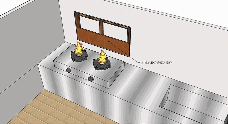 那不可完全封窗,只需封掉瓦斯爐上方約20公分之窗戶面積即可,