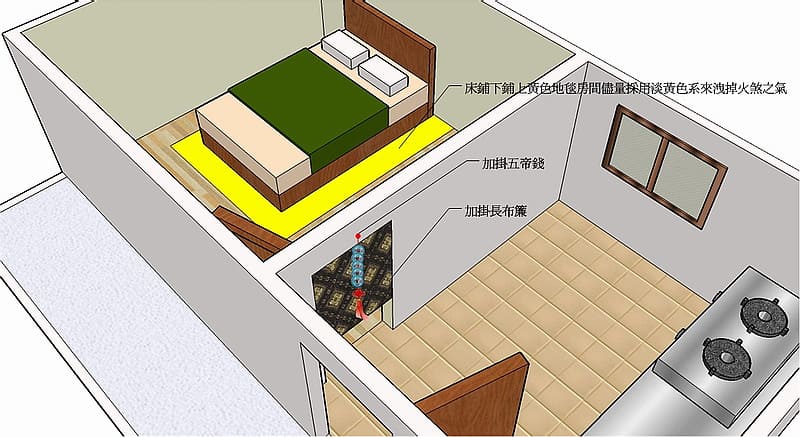 房門加掛長布簾和五帝錢先將廚房油煙廢氣燥熱氣場擋於門外,房內儘量採用淡黃色系去佈置來泄掉火煞之氣。