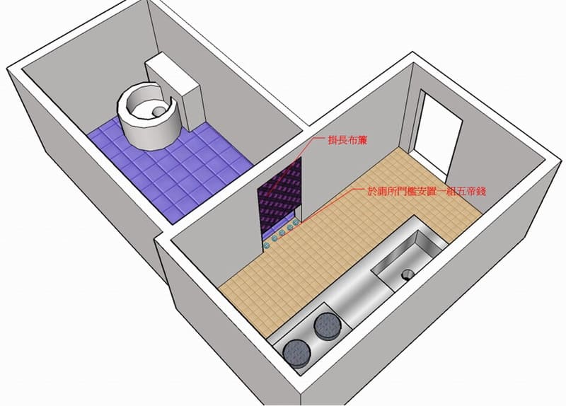 可以在廁所門加掛長布簾,並在廁所門門檻安置一組五帝錢
