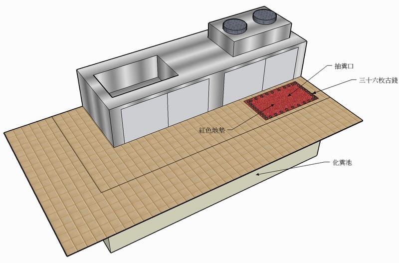 而於抽糞口蓋上塑膠地墊地墊下用36枚古錢