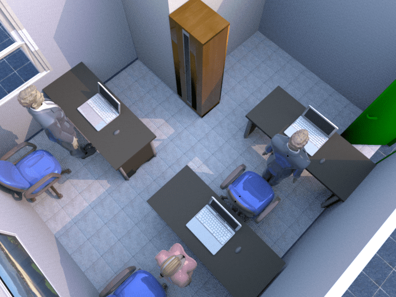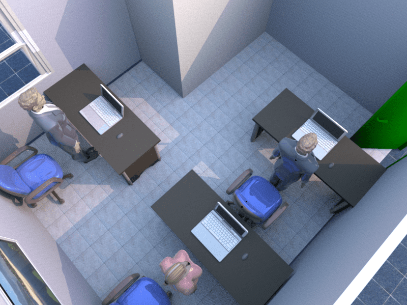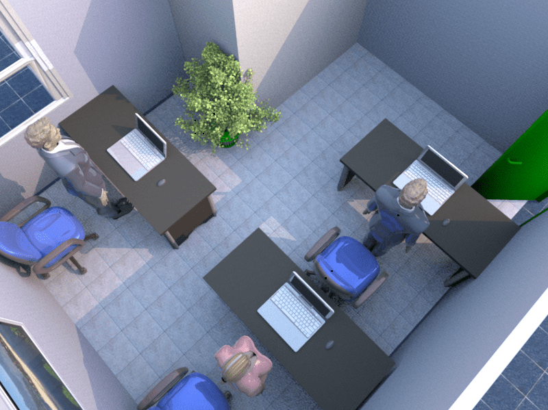 辦公桌正對壁刀,這通常出現在格局不方正的辦公室內,或是辦公室內有大的方形柱子所構成,