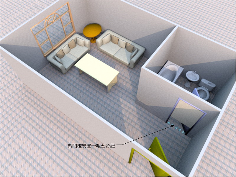如果無法設置屏風可以在廁所門加掛門簾遮擋並於門檻安置一組五帝錢來化解: