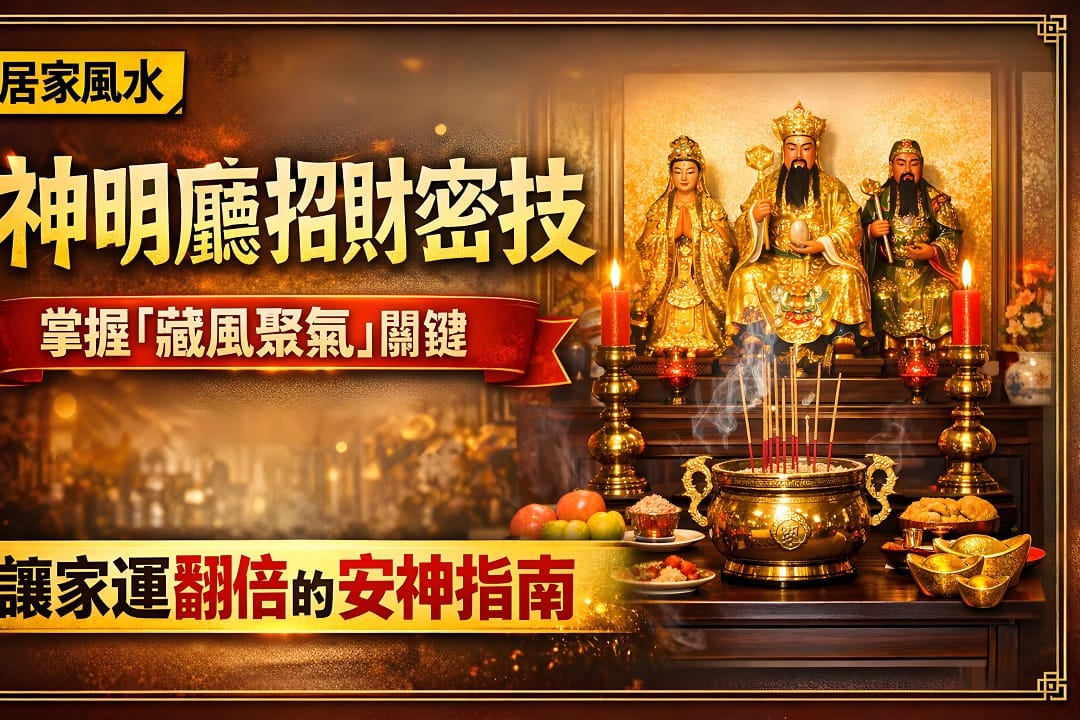 更新於 2026年04月13日09:20 • 發布於 2026年04月13日08:00 【居家風水】神明廳招財密技:掌握「藏風聚氣」關鍵,讓家運翻倍的安神指南。1.神明爐宜往前祖先爐宜往後,以顯示高低尊卑之順序。 2.一般家中供奉神明不宜過多,且須為單數以一尊、三尊最多五尊,不要超過五尊那就猶如神壇。 3.神桌前明堂宜開闊明亮,不可有煞氣,如果遇煞氣須先求化解再安神。 4.神桌後方之牆面最好為堅固之水泥牆,如果要使用木牆需用上好材質厚實之木板為宜。 5.神明廳宜潔淨、安寧、避免混亂吵雜之處。 6.神明之高度需超過祖先牌位之高度,不然會有女性掌權或是男性事業不順、身體不佳之效應。 7.樓梯下方或是騎樓上面之房間不可安神位,主艱辛、也不利家中小孩。 8.神桌不要安置於走道處,因為神桌宜藏風聚氣,位於走道氣散不聚,會有無神也無財之效應。 9.神位前不可正對房門或是廁所門,精神易受影響,也不可在神位前堆積雜物或是曬衣物,主不敬。 10.神桌上方或是前方日光燈宜平行懸掛,不宜與神位垂直對沖,此為懸劍或是稱為燈沖會有血光效應。 11.先安神明再安祖先牌位。 12.香爐之高度最好在神明之肚擠高度,不可過低形成踏爐,或是太高影響神明之視線。 13.平常時間絕對不可以移動香爐、神明、牌位,如要移動需要請當地老師幫您擇日移動。 14.安神後3天內需香火不斷。 15.神明前方不可有鏡子反射。 16.神桌所靠之牆面不可有水管通過最忌污水管線經過,會有家中錢財流失之效應。 17.神桌安置於陰暗處或天花板過低,運勢無法開展。 18.神桌背後牆面凹凸不平,主家運坎坷。 19.神像背後牆面歪斜,家人會彎腰駝背。 20.神桌背後一片白牆,家人孤獨。 21.神桌背後牆面潮濕發黴、油漆剝落,家人會有皮膚病或是癌症。 22.神像未擺正,會有精神異常、整天往外跑。 23.神明廳不可擺放未開光之神像,會造成陰邪入侵。 24.服喪帶孝期間,一年內不能安神,除非特殊情形。 25.祖先牌位兩旁字數宜為6字而中間之字數宜為12字,也就是以「生、老、病、死、苦」順序排列, 六個字剛好為生、12個字為老,此為兩生抱一老, 字數不可為病、死、苦這都會影響家運。