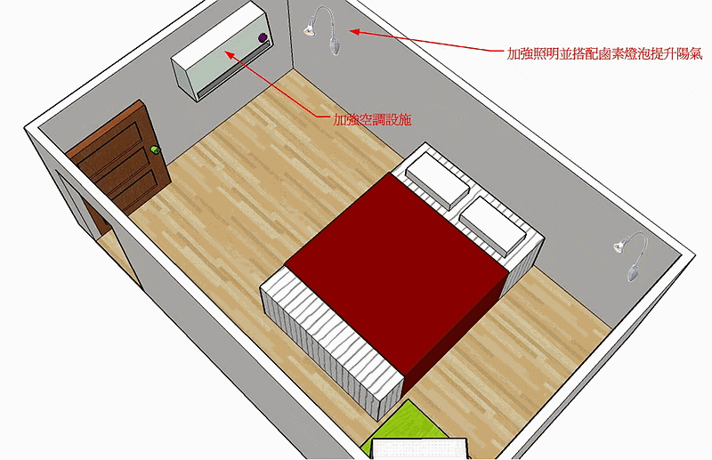 並加強照明而照明之燈俱搭配部分鹵素燈泡來提升房內之氣場降低其影響。