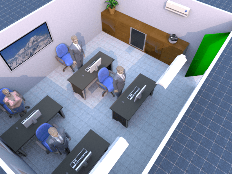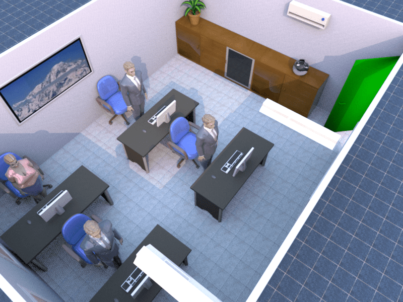 日光燈射辦公桌,有些辦公室為增加室內空氣流通,會在天花板加設吊扇,
