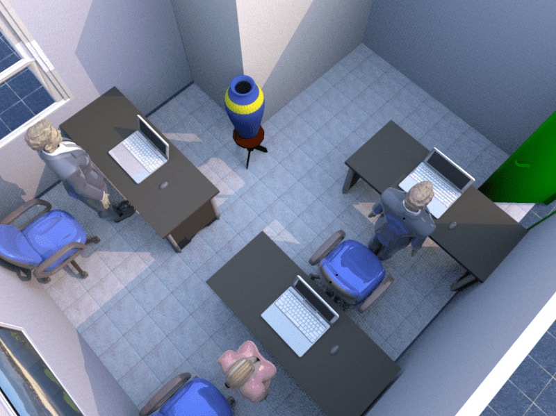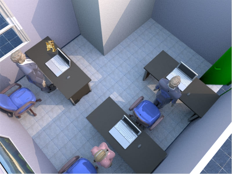 辦公桌正對壁刀,這通常出現在格局不方正的辦公室內,或是辦公室內有大的方形柱子所構成,